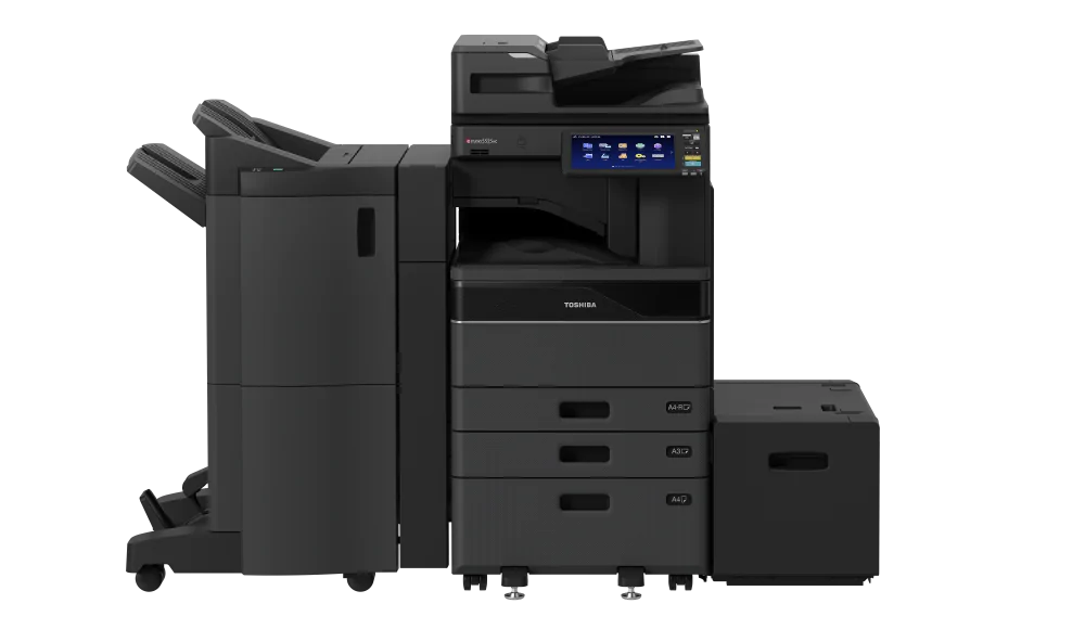 Reach printing speeds of up to 55 pages per minute with the Toshiba e-Studio 5525AC. This printer features a 1,200-input paper capacity, 6BM RAM, 1,200 x 1,200 dpi print resolution, and a 10.1-inch tablet-style touch colour control panel for easier and faster operation with high-quality prints. Remote Assist and e-Cloud Connect allow for service and assistance when you need it. This printer is sure to meet your business needs.